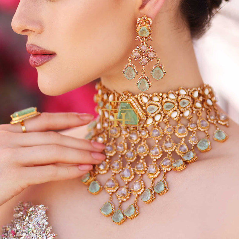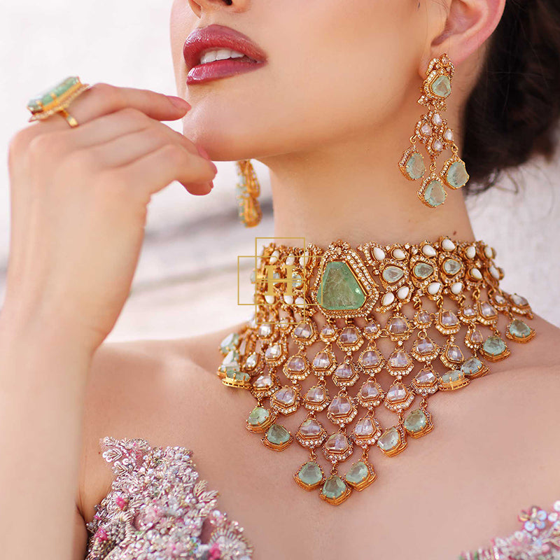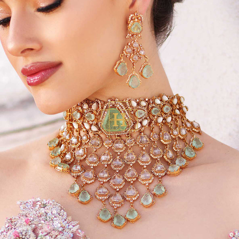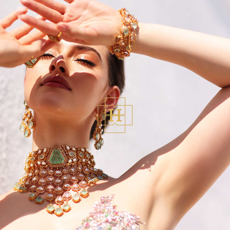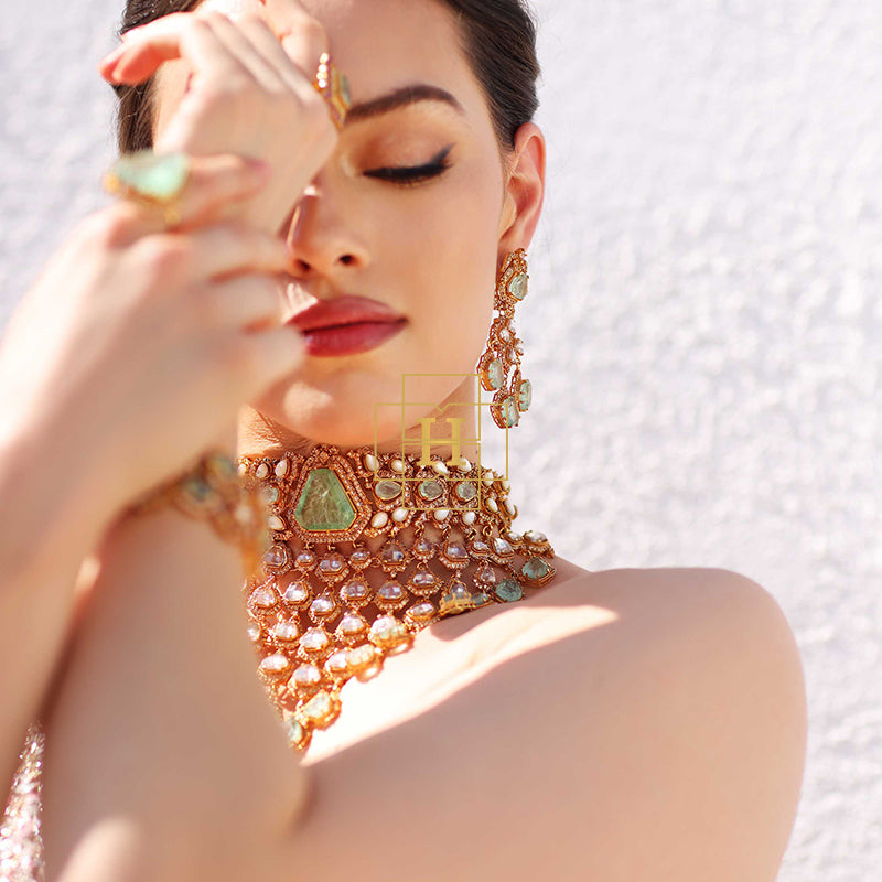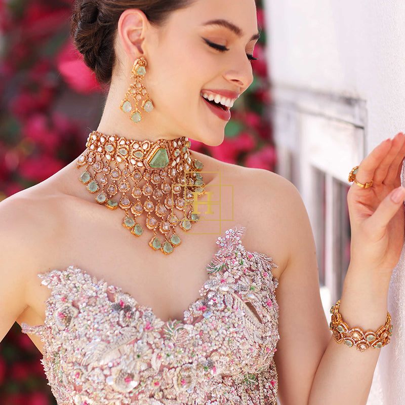 Hamna Amir presents timeless designer jewelry crafted with Russian stones, emerald hues, champagne zircon, and classic polki zirconic. Each piece blends traditional elegance with modern luxury.