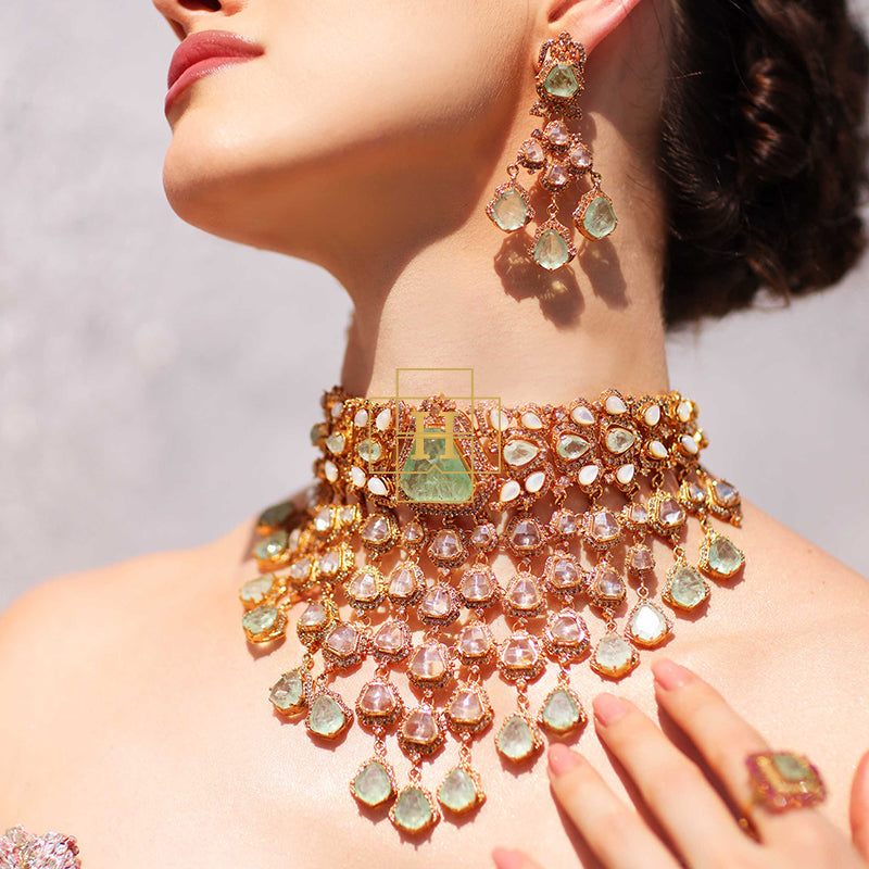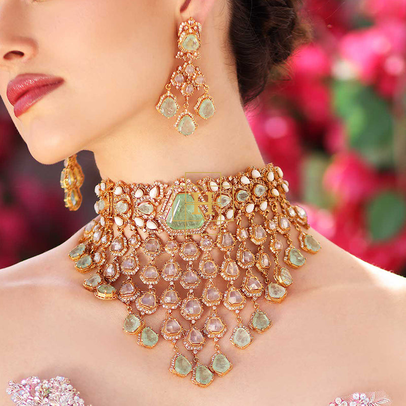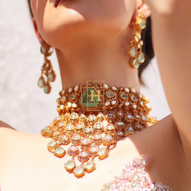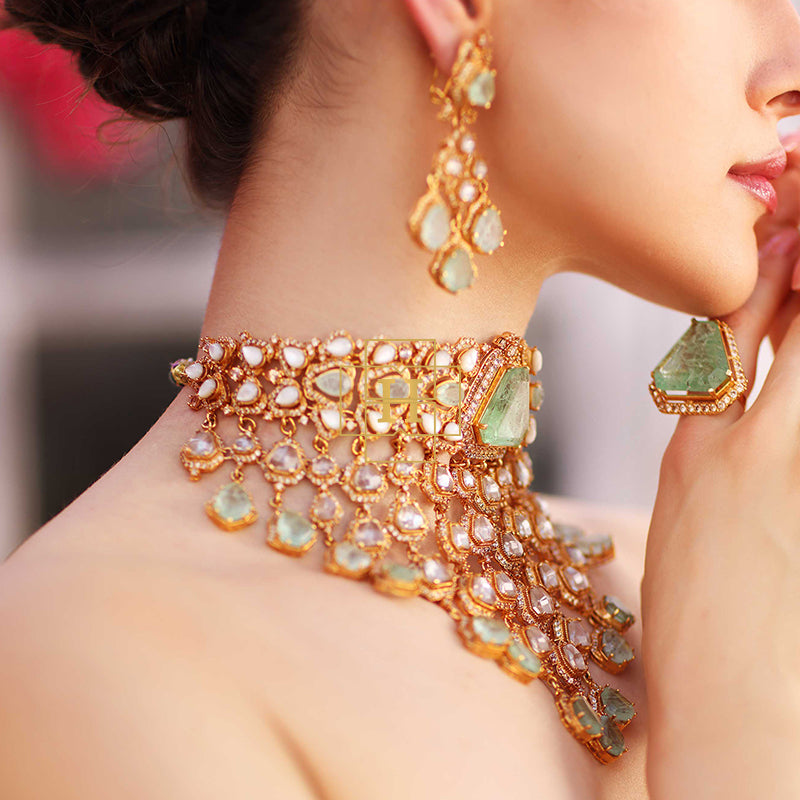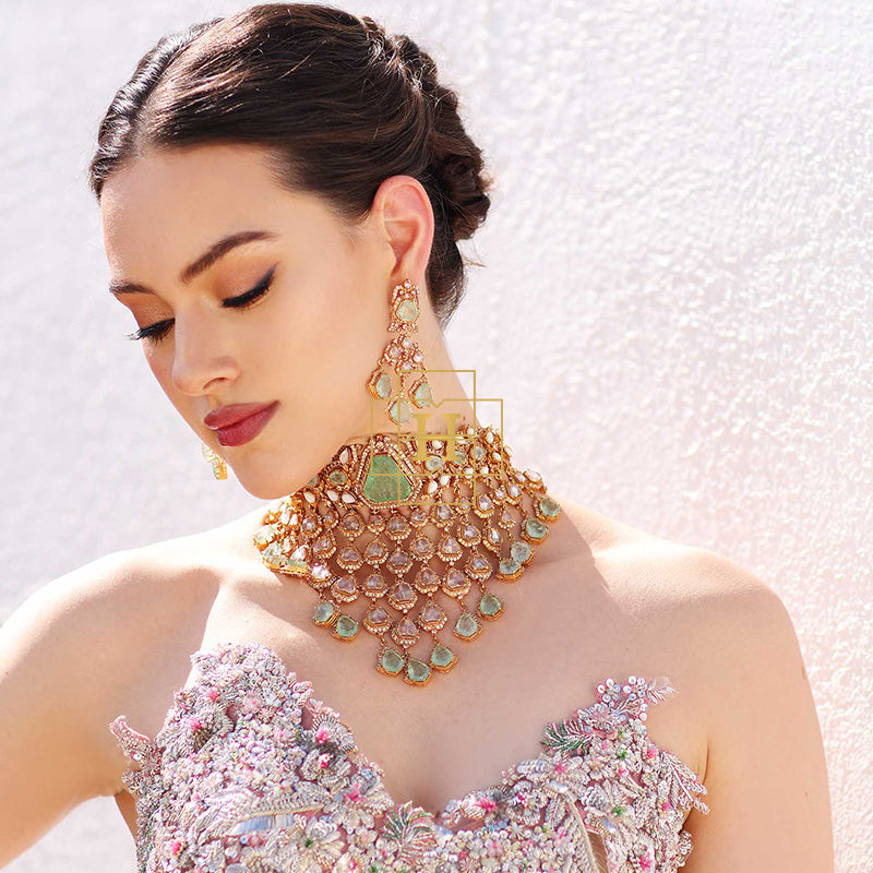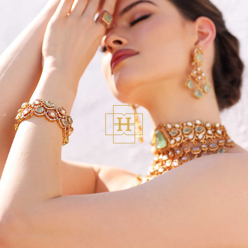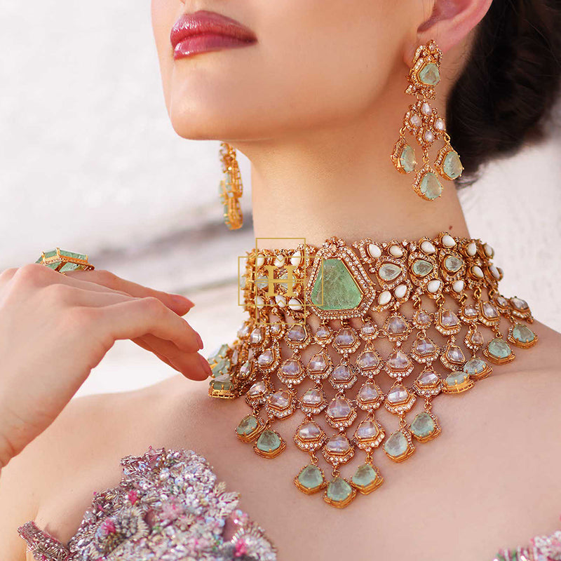 Hamna Amir presents timeless designer jewelry crafted with Russian stones, emerald hues, champagne zircon, and classic polki zirconic. Each piece blends traditional elegance with modern luxury.