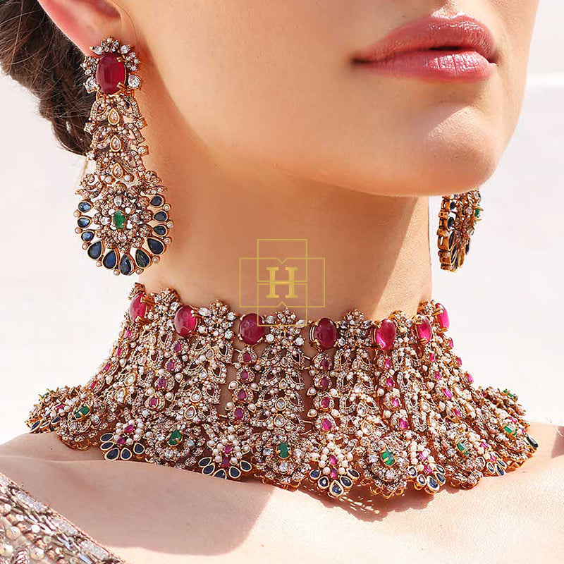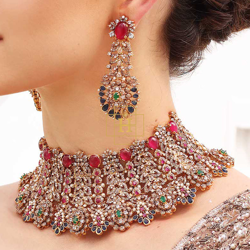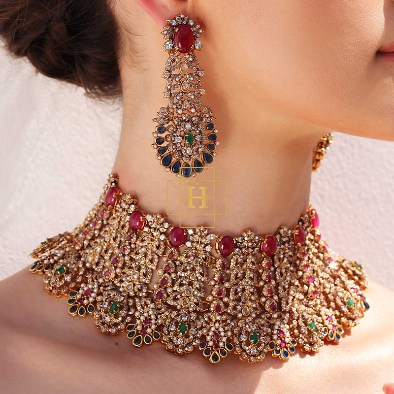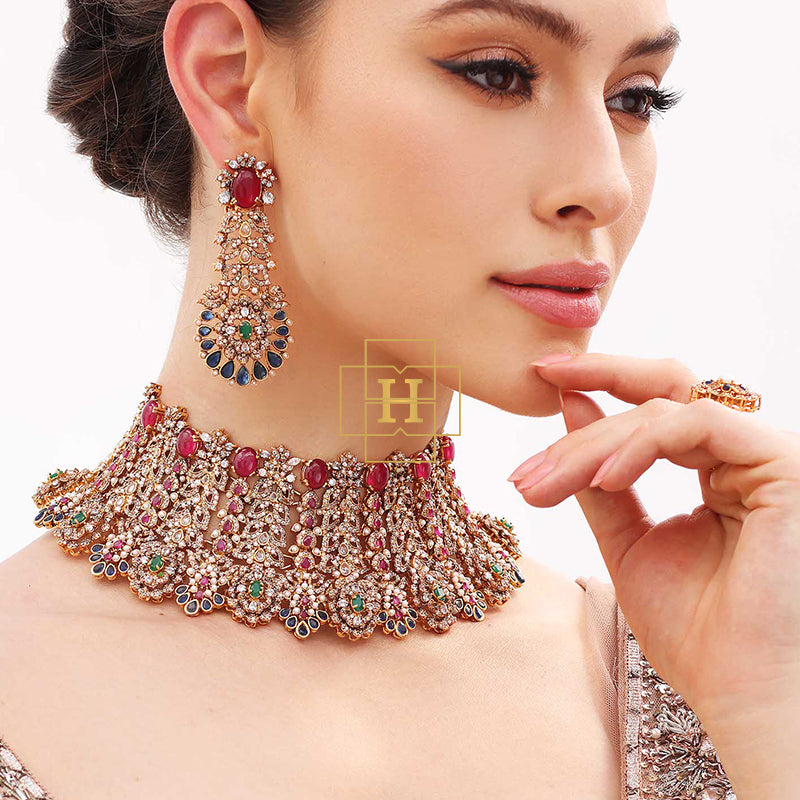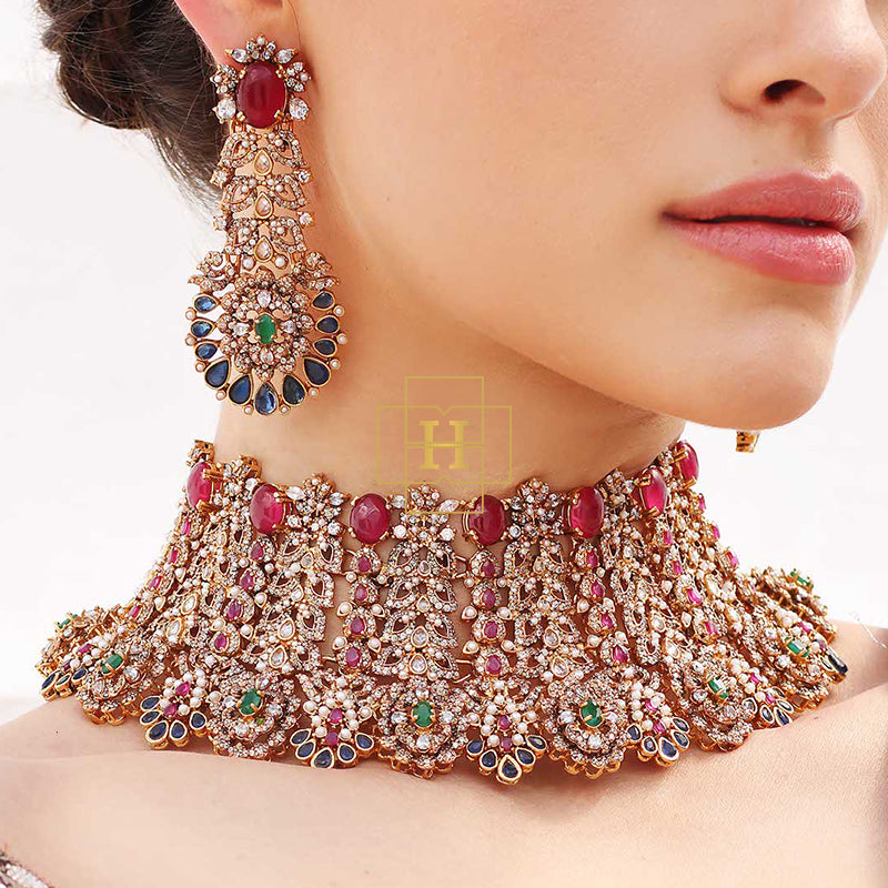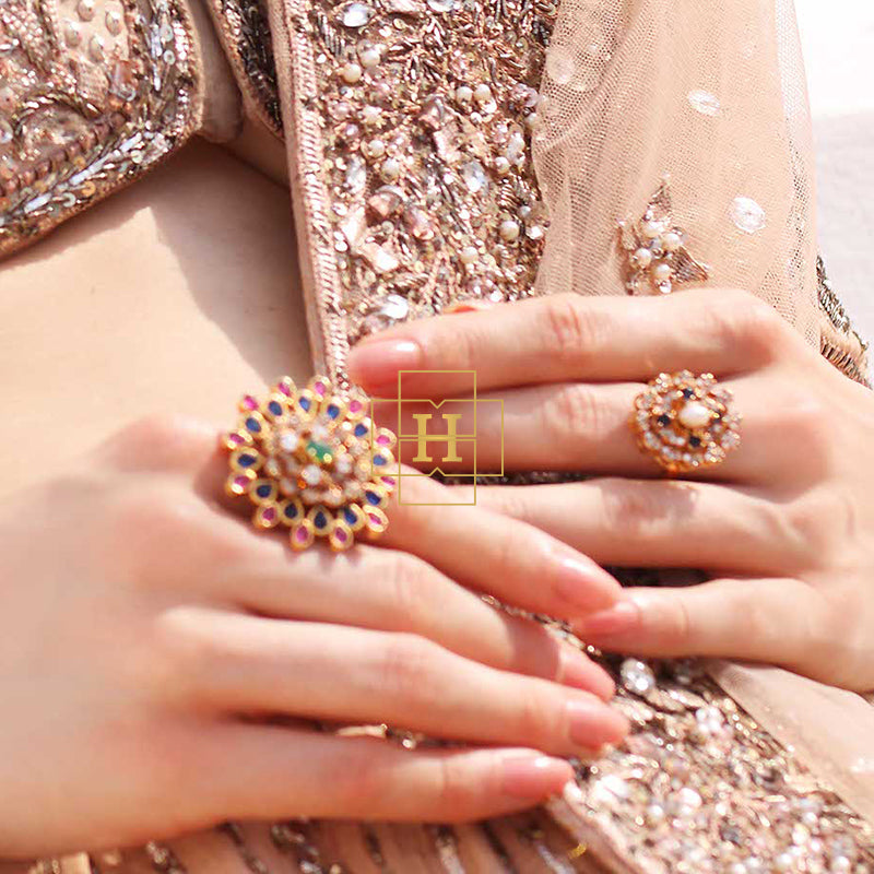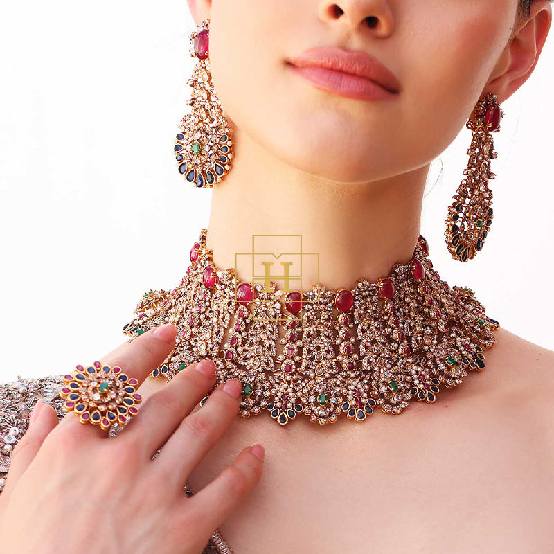 Crafted for refined taste, Hamna Amir jewelry features the brilliance of champagne zircon, rich ruby, emerald, sapphire, luminous pearls, and classic polki zirconic—perfect for statement luxury.