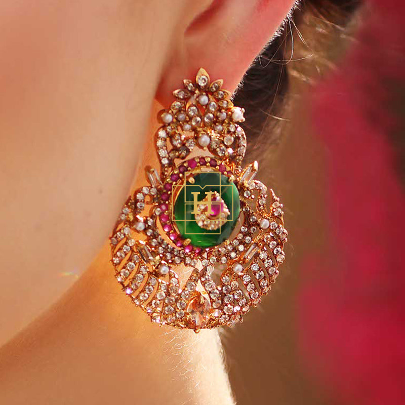 An elegant emerald ring adorned with champagne zircon, ruby accents, and luminous pearls. A timeless statement piece crafted for refined sophistication.