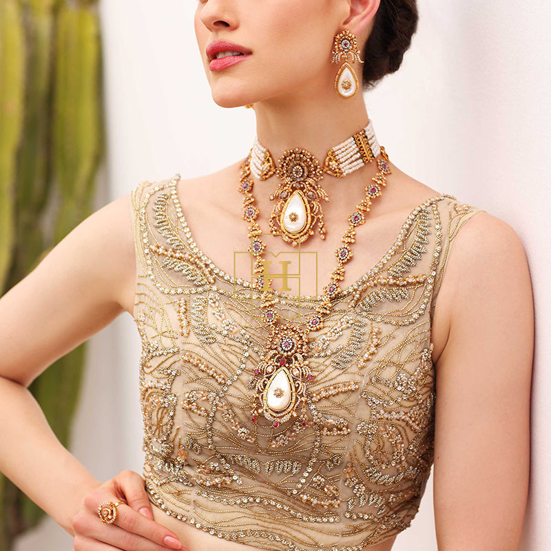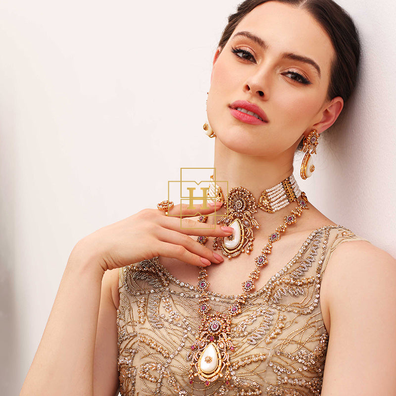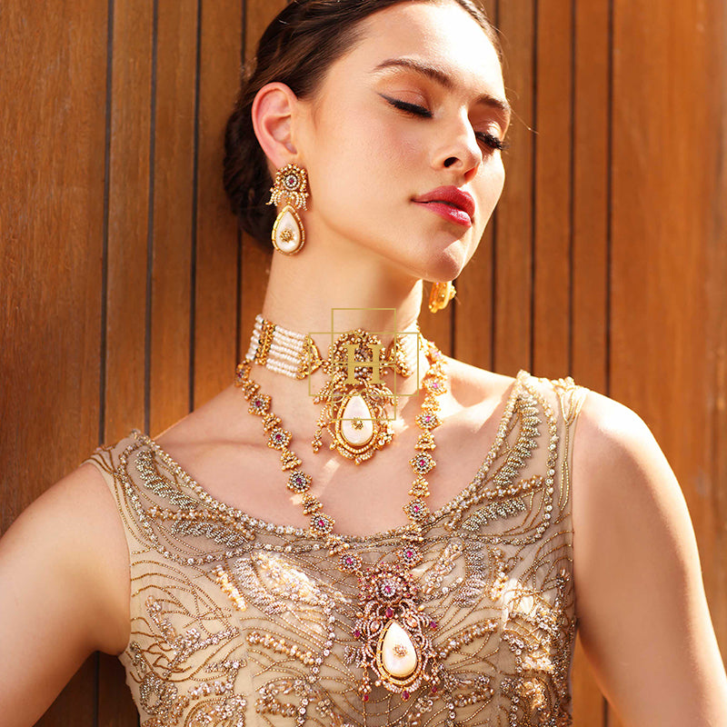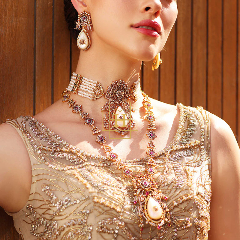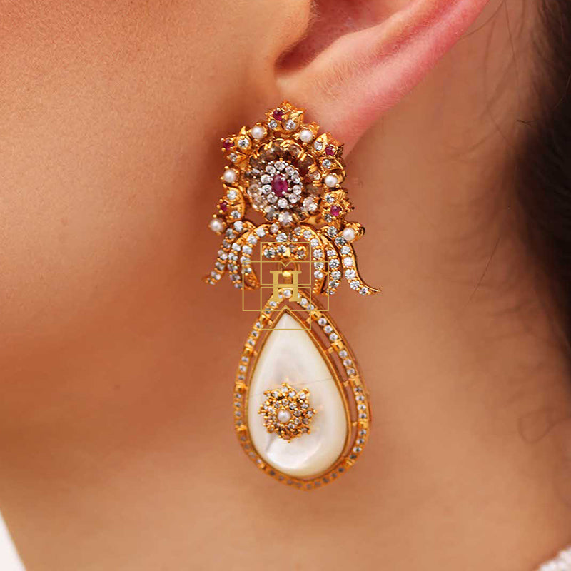 A refined creation featuring mother of pearl, ruby accents, luminous pearls, polki zirconic, and champagne zircon. Designed to embody timeless elegance with a touch of modern luxury.