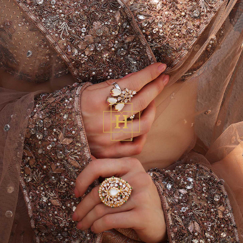 An elegant fusion of pink tourmalines, emerald, mother of pearl, and cubic zircons—designed to reflect refined luxury and delicate sophistication.